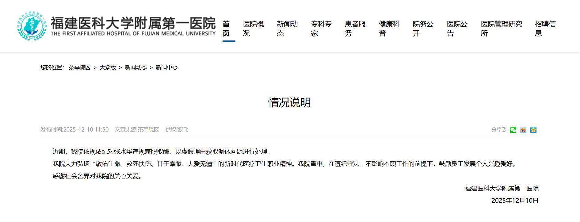 12月10日,福建医科大学附属第一医院发布情况说明称,依规依纪对“最快女护士”张水华违规兼职取酬、以虚假理由获取调休问题进行处理。